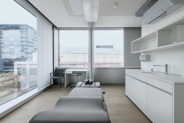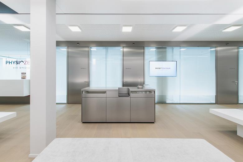 Der kühle Materialmix aus Aluminium und Glas kommt in den Praxisräumen nicht von ungefähr: Auch der Bau selbst – direkt am Bahnhof Altstetten gelegen und ursprünglich als Bürogebäude konzipiert – spricht eine nüchterne Sprache.