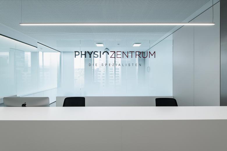 Um auch genügend Tageslicht ins Innere der Praxis zu holen, wurden die Therapieräumen zum Flur hin verglast. Punktrasterfolien mit Transparenzverlauf sorgen dabei für Sichtschutz und garantieren den Patienten die nötige Privatsphäre während der Behandlungen.