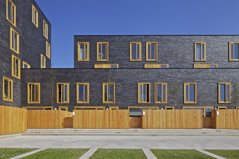 We attentively drawn the “entrance” sequences. The groundfloor dwellings are slightly above the level of the street to protect a certain intimacy. It is used as a pretext to create a small landscape project in the courtyard. The front doors of individual houses integrate bells and mailboxes while assuming the protective function of canopies. Elements are subtlely graded from public to private : parking, staircases, joineries... The hall receives specific treatments as many qualitative common spaces are crossed to arrive ‘at home’.Windows and bricks have been drawn and built with concern. Facades are insolated double walls, concrete-insolation-brick. The sliding joineries are made of movingui. They are maintained in overhang of the facades by massive wooden pre-frames fixed to the concrete wall. Every joinery constitutes a space in itself. Their projection towards the outside allows to enlarge the space of the dwellings and to animate facades with the movement of shadows. The wide proportion of glass surface and the use of light railings allow to propose particularly bright and qualitative appartements.