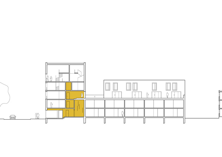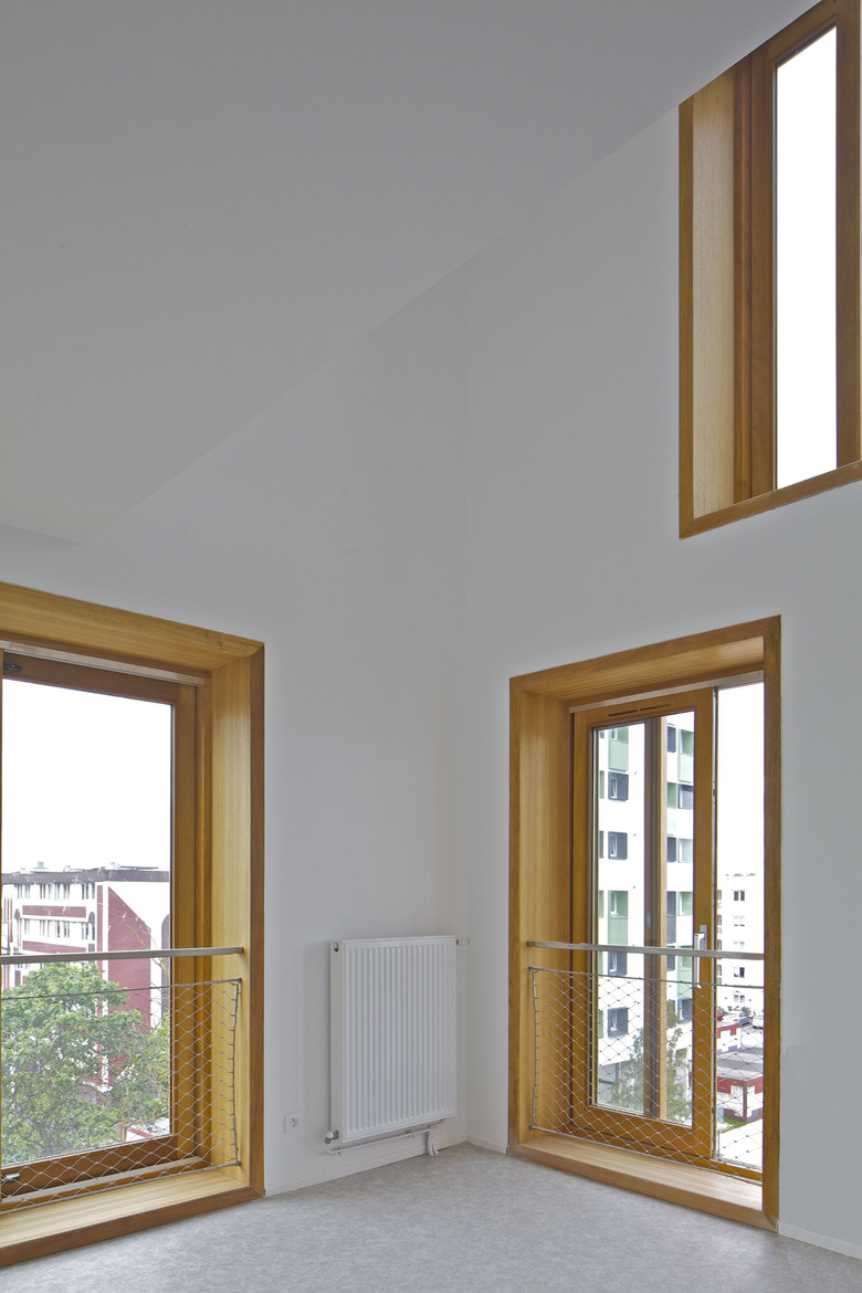 The project is situated in the district of Mont-Liébaut, in the outskirts of Béthune, in a district registered on the program of the National Agency for the Urban Renovation (ANRU). This project groups together 23 ‘semi-collective’ social housing units. The inspiration for the design came from research into new qualities developed at the interface between the individual and the collective: a sustainable lifestyle combined with the advantages of individual housing. We tried to create a unique building with very different typologies: individual housing with garden, penthouse duplex with shared terrace, apartment with garden on the groundfloor and panoramic dwellings, ranging from the simplex to the triplex, with terraces offering views of the Belfry of Béthune and over coal tips to the Horizon.The building is located at the angle of two urban axes, boulevard de Hollande and boulevard de Varsovie. To put in coherence the public place, it respects the alignments on street and marks the angle by an extra height. It presents cuts which give rythm to the facade and create private and shared terraces. Five “running through” duplex houses in the groundfloor, and four duplex on a passageway in the 2nd floor take place as individual houses along the boulevard de Hollande. Along the boulevard de Varsovie take place “collective dwellings”, multi-directed simplex up to the 2nd floor and five triplex apartments with double-heights in the highest floors.