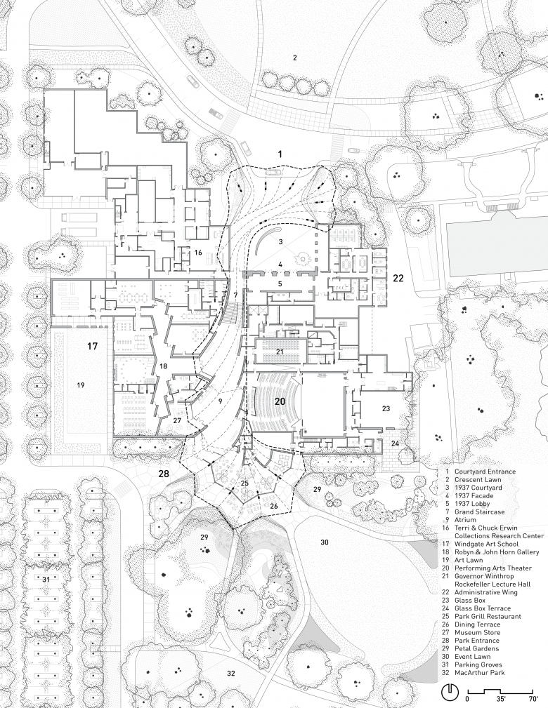 The design also treats architecture and landscape as intrinsically linked. An 11-acre renewed landscape, designed by SCAPE, extends the Museum experience into the outdoors, bringing a biodiverse array of new plantings that provide shade and beauty for indoor/outdoor social spaces, as well as new paths that allow the public to enjoy nature and view outdoor sculptures.