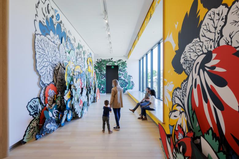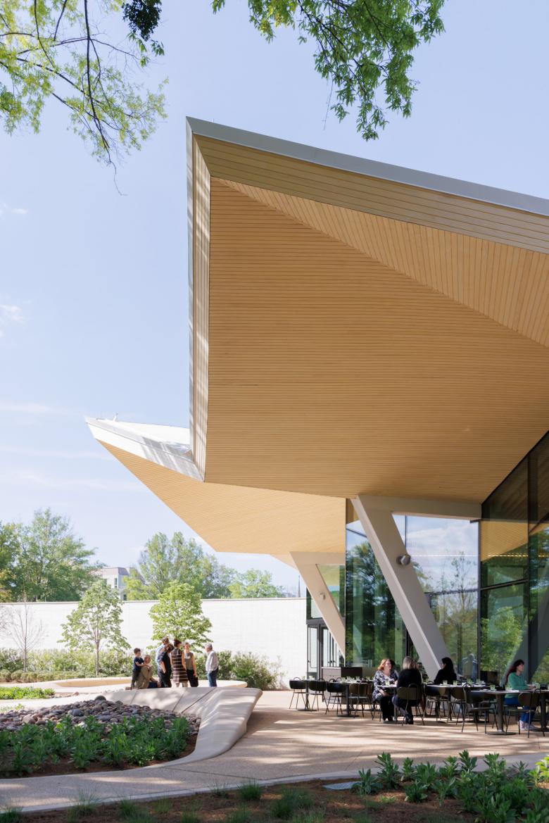 At each end, the central stem appears to blossom outward, opening the museum to its surroundings and welcoming the public in. To the north is the Cultural Living Room, a hovering, transparent volume that serves as a community gathering space and as a beacon that welcomes visitors to AMFA. To the south, the deep overhangs of the roof create a sheltered dining terrace for the new indoor-outdoor restaurant that steps down to meet MacArthur Park.
