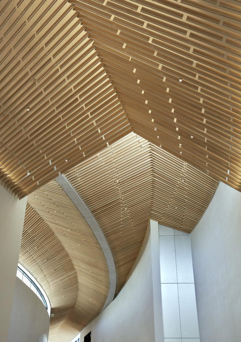 Both inside and outside, the organic, curving form of the central stem responds directly to the constraints of the existing structure and foundations, which were substantially preserved as part of the design’s sustainable approach. Its distinctive roof is an innovative, folded-plate structure made of cast-in-place concrete. Stepping down in height with the site’s topography, its clerestory windows fill the interior of the museum with natural light, while its sheltering overhangs protect from the heat of the sun.