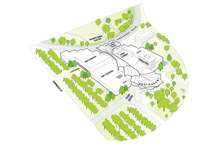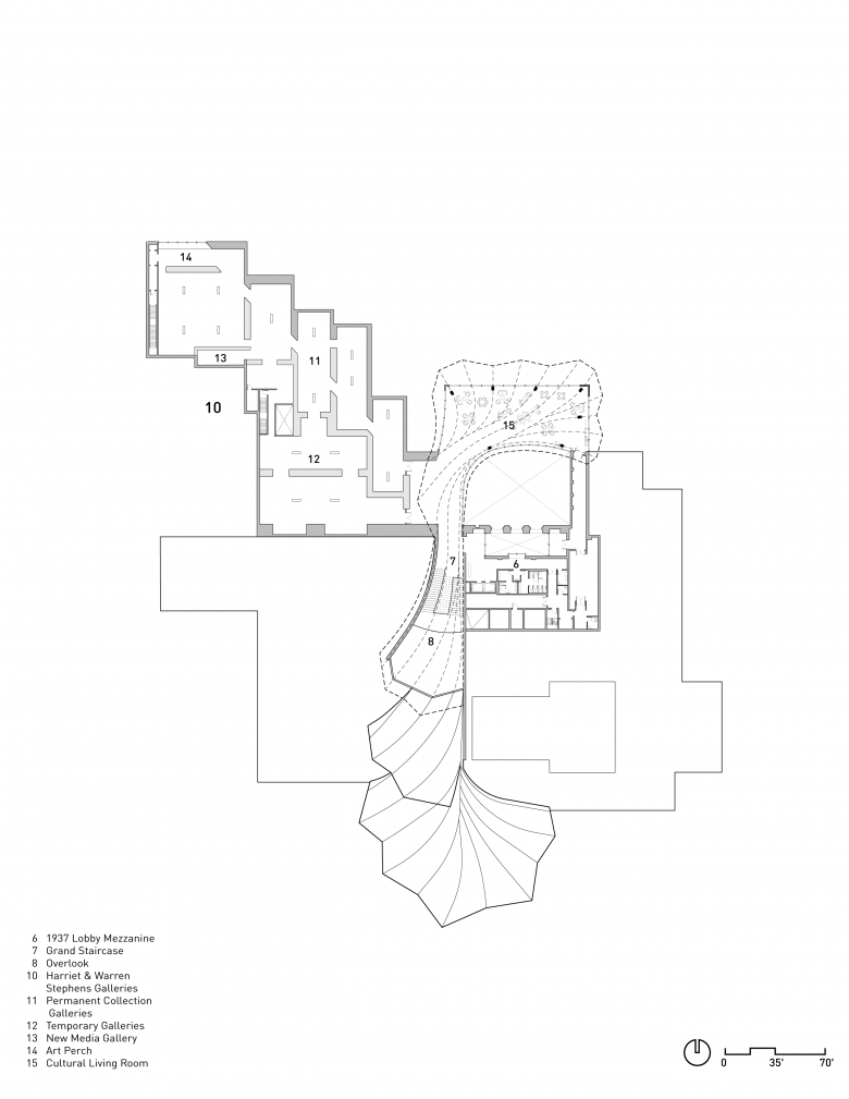 Studio Gang’s design creates a 133,000-square-foot building that embraces the surrounding city and park while also establishing a bold new architectural identity for AMFA. The design revitalizes the Museum’s eight existing structures, which were built in different eras and architectural styles, by reconfiguring them in a way that allows them to work together as a cohesive building. It also introduces an addition that runs through the center of the entire building like a stem, unifying and reorganizing the Museum’s existing functions and enabling a seamless flow through the building and across the site.