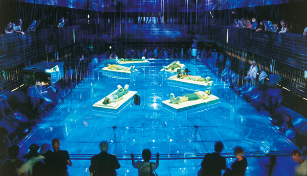 Thematische Inszenierung – In Anlehnung an eine traditionelle Schweizer Badeanstalt wurde der 'Cyberhelvetia'-Pavillon auf der Expo.02 als Ort der persönlichen Begegnung und Kommunikation konzipiert. Kommunikation kann heutzutage auf vielfältige Art und Weise stattfinden, unabhängig von Ort und Sprache. Auch ein gemeinsames Bad benötigt kein reales Wasser mehr: Ein blau leuchtender Glasquader ersetzte das reale Schwimmbecken – die Ausstellungsbesucher tauchten kopfüber in die vielschichtige Atmosphäre einer virtuell erweiterten Wirklichkeit und badeten in Licht und Klang.