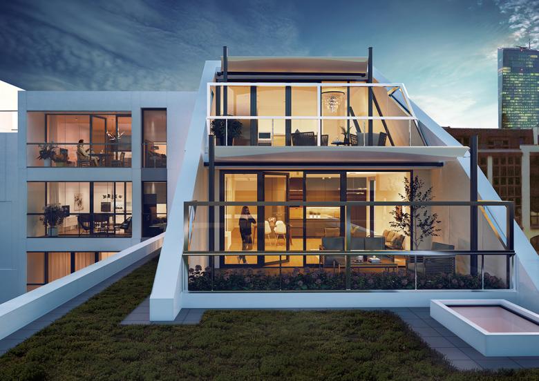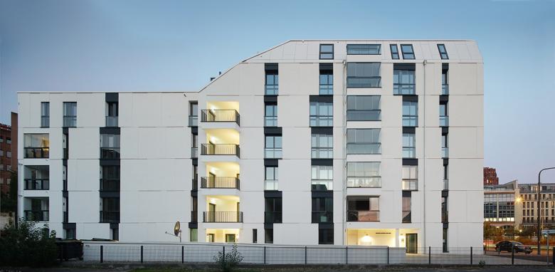 Im urbanen Deutschherrnviertel in Frankfurt Sachsenhausen hat Franken Architekten für die Lechner Group ein hochwertiges Wohngebäude mit 28 Wohnungen von 49 bis 144 m² Wohnfläche, zwei Penthouse-Wohnungen und einer Praxis bzw. Bürofläche geplant.