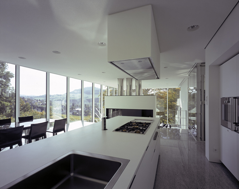 最下階にパーキングとオフィス、中間階に各寝室や畳敷きのメディテーションルーム、最上階にリビング・ダイニング・スペースを配置し、各階が斜面に沿うように半階ずつずれる、というスプリットレベルの断面構成である。その結果、許される高さ一杯でフラットルーフを載せた最上階のリビング・ダイニングの大きなワンルーム空間では、床面はスキップする下層に従ってレベルを変え、リビング部分が1層半、ダイニング部分が1層分の天井高となっている。その最上階の空間は外部のテラスを2つ持つガラスのボックスであり、南ドイツの風景と自然を十二分に堪能できるよう計画した。
