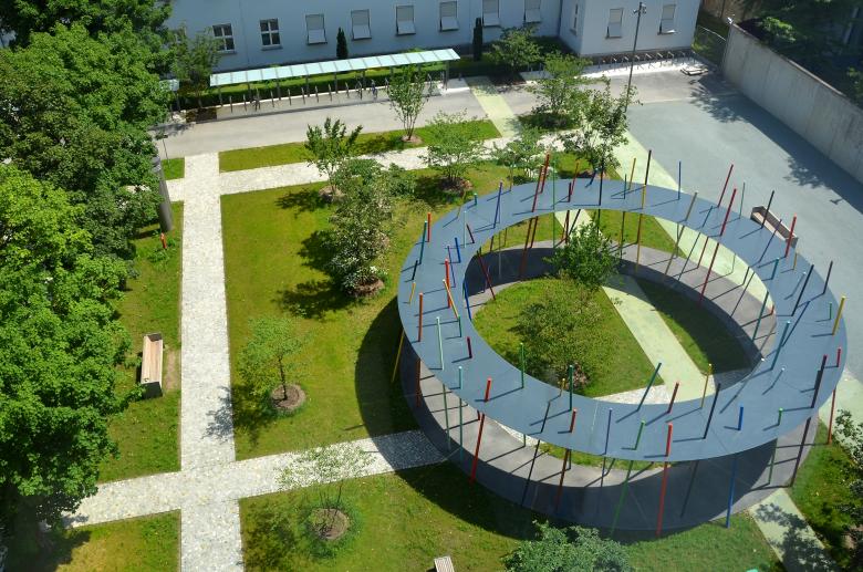 Leicht, licht- und luftdurchlässig, ermöglicht die skulpturale Qualität des Pavillons eine Vielzahl von Ansichten, Ein- und Durchblicken. Die bunten Stützen verschieben und überlagern sich durch den Perspektivwechsel des Betrachters zu immer neuen Linienzeichnungen. Der spielerische Umgang mit linearen Geometrien wird von der hainartigen Bepflanzung aufgenommen und breitet sich über den gesamten Innenhof aus. Wir haben nur jene Arten der Kornelkirsche verwendet, die auf allen Kontinenten zu Hause sind. Die Stämme der Bäume überlagern sich mit den Stützen des Pavillons und ergänzen die geraden Linien mit organisch geschwungenen oder geknickten Formen. Im neu gestalteten Innenhof vermischen sich artifizielles und natürliches, Kunst und Alltag und inspirieren zu neuen Sichtweisen.