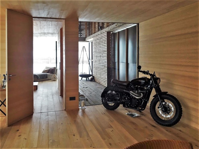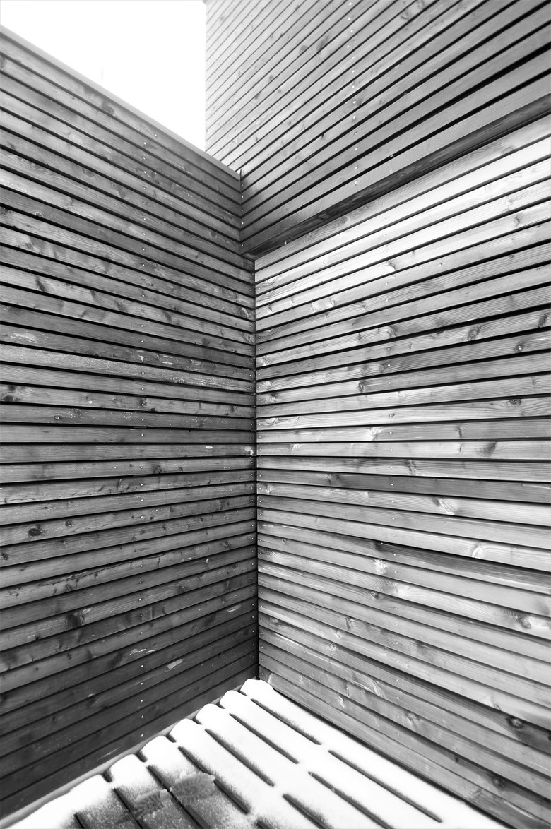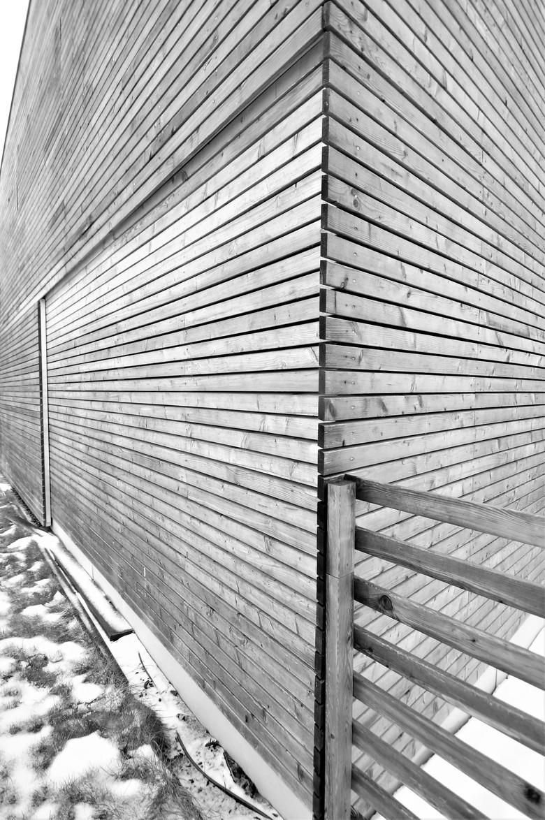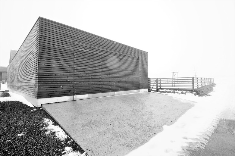 Aus diesen Gegensätzen leitet sich das Entwurfsmotiv ab. Durch wenige Handgriffe offenbart der vorher verschlossene und abweisende Baukörper sein überraschend geräumiges inneres Raumgefüge von Wohnhaus, Jagdzimmer und Patio. Großflächige Verglasungen öffnen den Innenraum zur Landschaft. Zwischen innerer und äußerer Hülle entsteht ein hybrider Raum, dessen Nutzung und Charakter sich mit der Stellung der Schiebewände ändert.