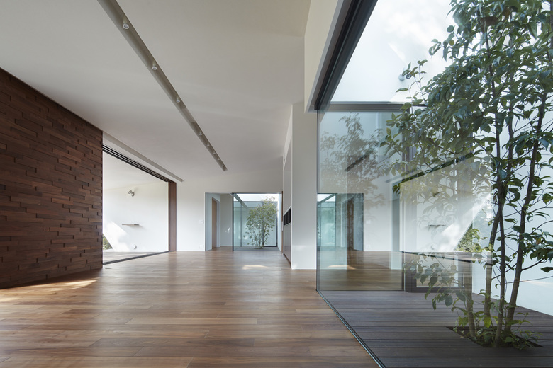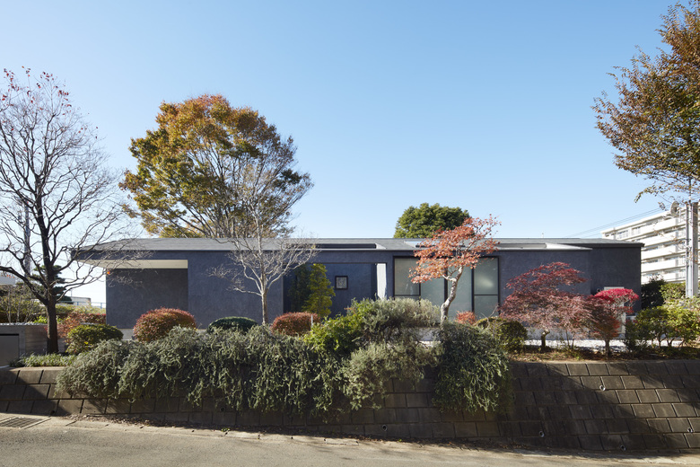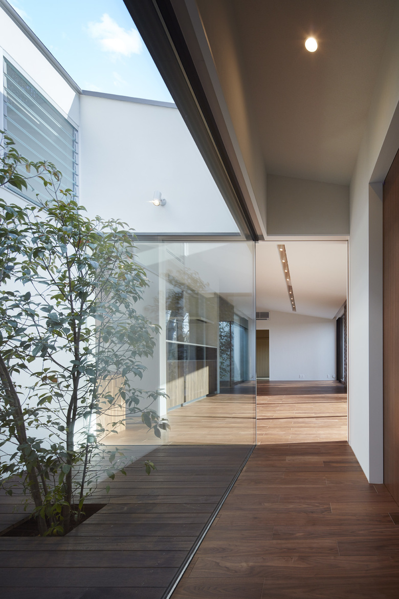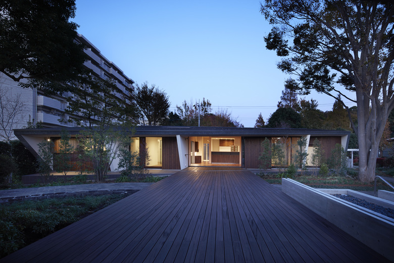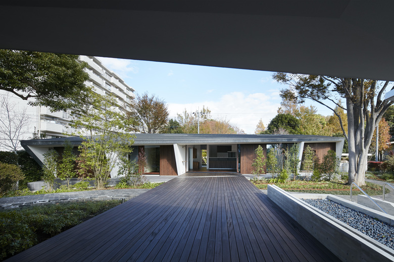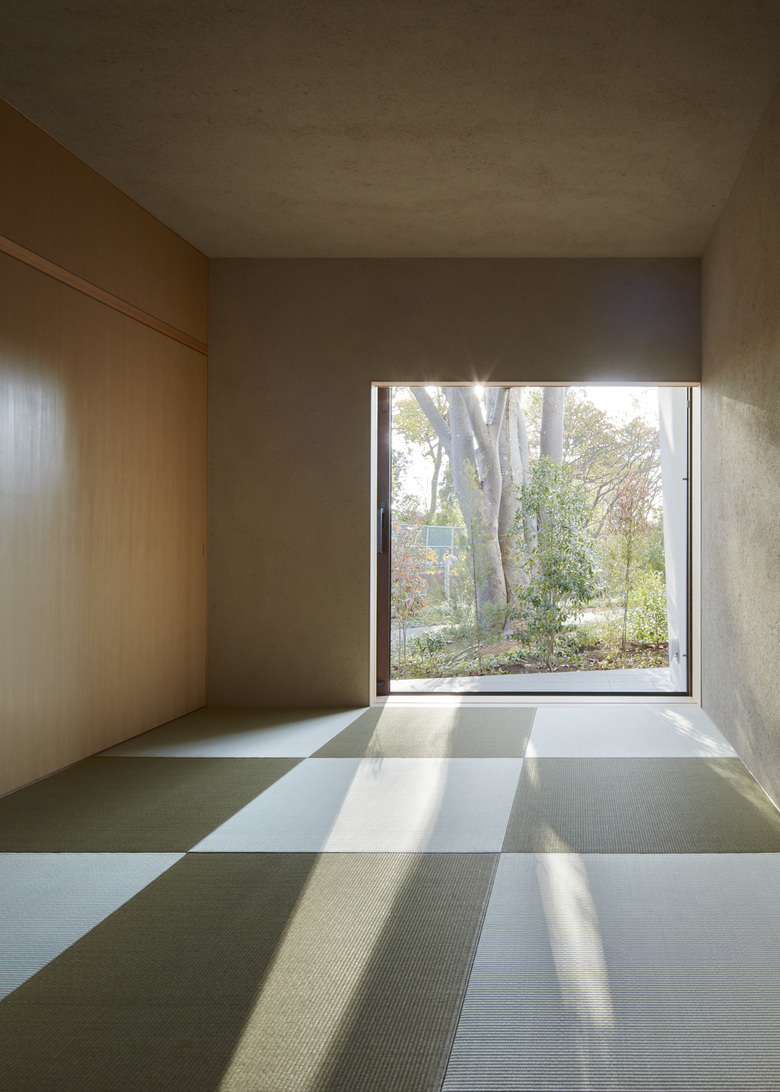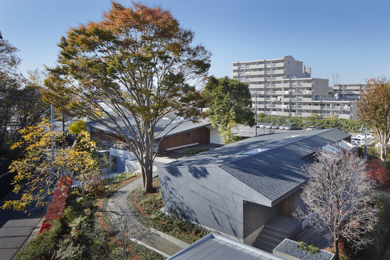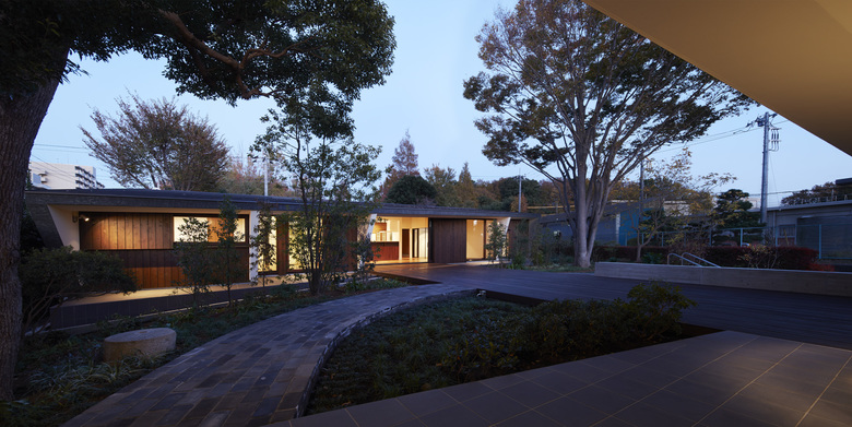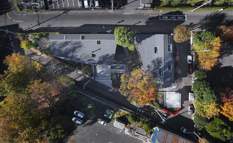The garden surrounded by large zelkova and camphor trees on the site and the two houses is the centerpiece of the project, loosely connecting the two houses.