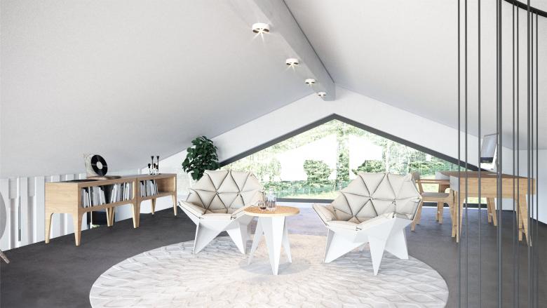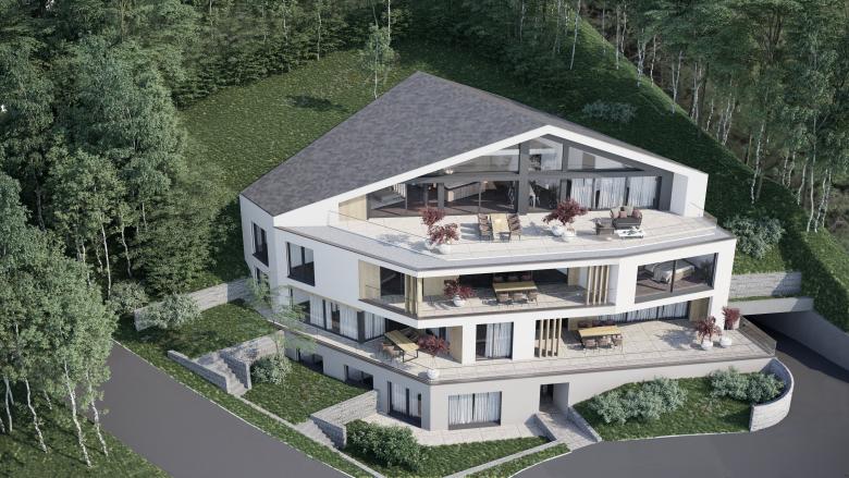Der Gebäudekörper erscheint wie ein geschliffener Kristall, welcher die ursprüngliche Hangneigung in seiner Dachform übernimmt und mit seiner leicht gestaffelten Fassadenabwicklung fein und elegant in Erscheinung tritt.