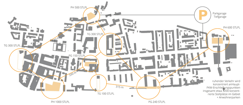 Die stadtraumverträgliche und praxistaugliche Lenkung des suchenden und ruhenden Verkehrs ist Voraussetzung aller städtebaulichen Interventionen. Parkhäuser an der Peripherie fangen den Parksuchverkehr vor dem Eindringen ins Quartier in fußläufiger Entfernung von Ausbildungsstätten und Arbeitsplätzen ab.