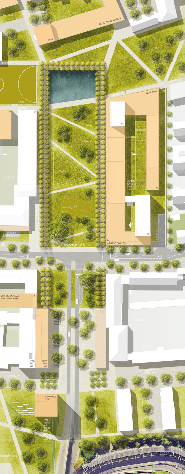 Ein Netz aus barrierefreien Fuß- und Radwegen führt in die grüne Mitte. Das Bassin als blaues Gelenk zwischen Sport-, Aktivitäts- und Ruhezonen bildet das atmosphärische Zentrum der ausgedehnten Freiräume des südlichen Roonparks. Differenzierten Zonen und Topografien ermöglichen ein breites, generationenübergreifendes Nutzungsspektrum. Die Pappelallee rahmt Baumgruppen und Solitäre in freier Stellung. Wertvoller Baumbestand wird integriert. Bänke, Sitzstufen und Liegewiesen laden zum Verweilen ein.