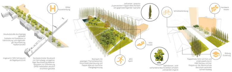 In Nord-Süd-Richtung, zwischen Westspange und Metzer Straße, wird der Roonpark grünes Rückgrat und Entrée des Stadtteils. Die Pappel-Allee bindet als flussübergreifendes Metazeichen beide Saarseiten thematisch zusammen, ordnet und homogenisiert den Raum.
