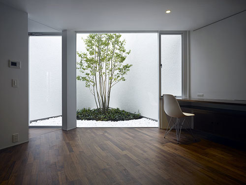 A tsuboniwa garden was created to bring light into the Japanese-style room and bathroom on the first floor. The square plan is 1.8m on a side, and the lightwell is 6.5m high.