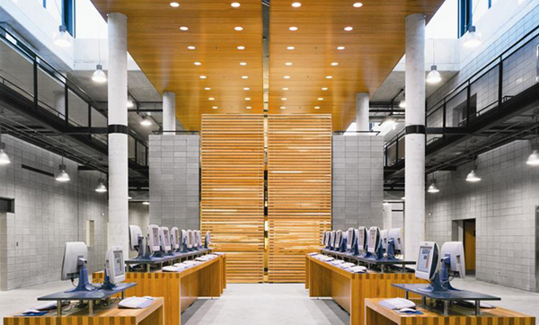 the valley edge. This project involves the creation of a new central library which will serve the entire Scarborough campus, combined with a new 500-seat lecture theatre and a small art gallery. The building program embraces 18,000 square feet of renovated space and 80,000 square feet of new construction on two floors; the program incorporates 17,000 square feet of book stacks, 665 study spaces with 90 networked study units, laboratories and workrooms comprising an 8,300 square feet Teaching and Learning Center, an extensive Collections Management and Circulation Area, Advising and Career Center, and supporting offices. The Academic Resource Centre is the first stage of the University’s program of planned new growth. This development must respect the architectural vision of John Andrews, while considering the future potentials of the site and its surrounding area. To this end, a strategy that combined consolidation and infill was used. In addition to the new program of construction, extensive renovations of existing buildings were undertaken. The new building has a potential for vertical expansion, with the possible addition of a third floor in a later phase. Horizontal expansion can be facilitated through the repetition of the modular ‘boat’ forms on plan. Additionally, the archetypal courtyard, street and boat forms may be repeated as the needs of the university develop and change.