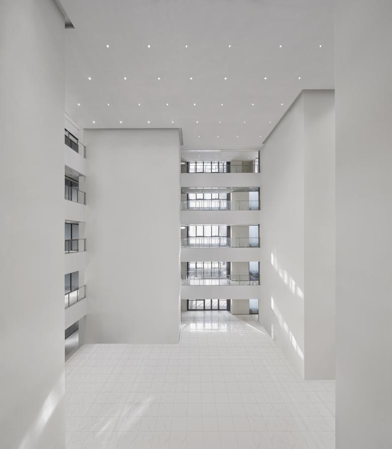 An atrium located in the center of a building can feel claustrophobic due to the lack of natural light. In order to create an open atrium, we designed a "crack" in the exterior wall through which direct light shines into the atrium. In order to allow the reflected light to reach as far as possible into the atrium, the atrium is a minimalist white space.