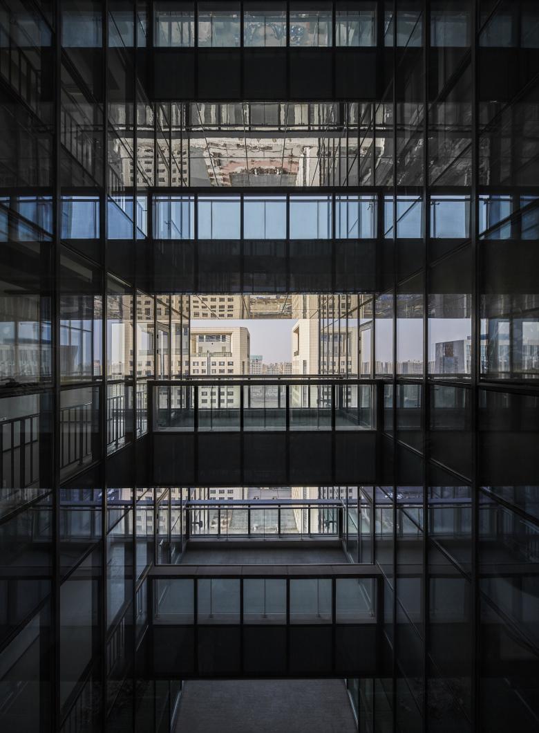 This large square plane encompasses a 27m square atrium, which is vertically stacked from ground level with two, five, six, five, six, and two tiers of atriums. The first two-level atrium is the entrance hall and retail atrium. The atrium above it is the common office space, with elevator banks located at the four corners of the atrium providing individual access to each. The office space surrounding the atrium is planned in such a way that a single company may occupy it exclusively or many companies may share it.