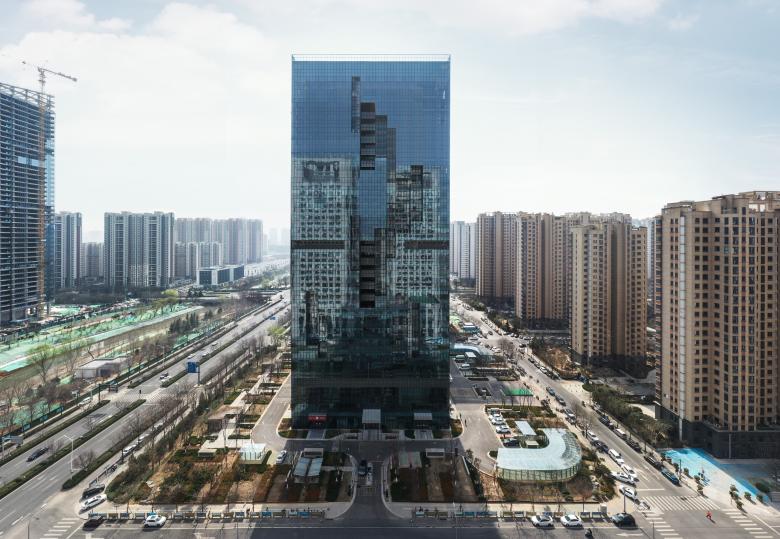 The 29-story office building with a maximum height of 126 m is located in the development zone around the new high-speed railroad station. 500% floor area ratio and economic rationality have led to the adoption of twin towers in the surrounding areas with the same conditions. The 54.4 m square plan is the square root of 3,000 m2, which is a critical measure for area zoning.
