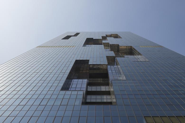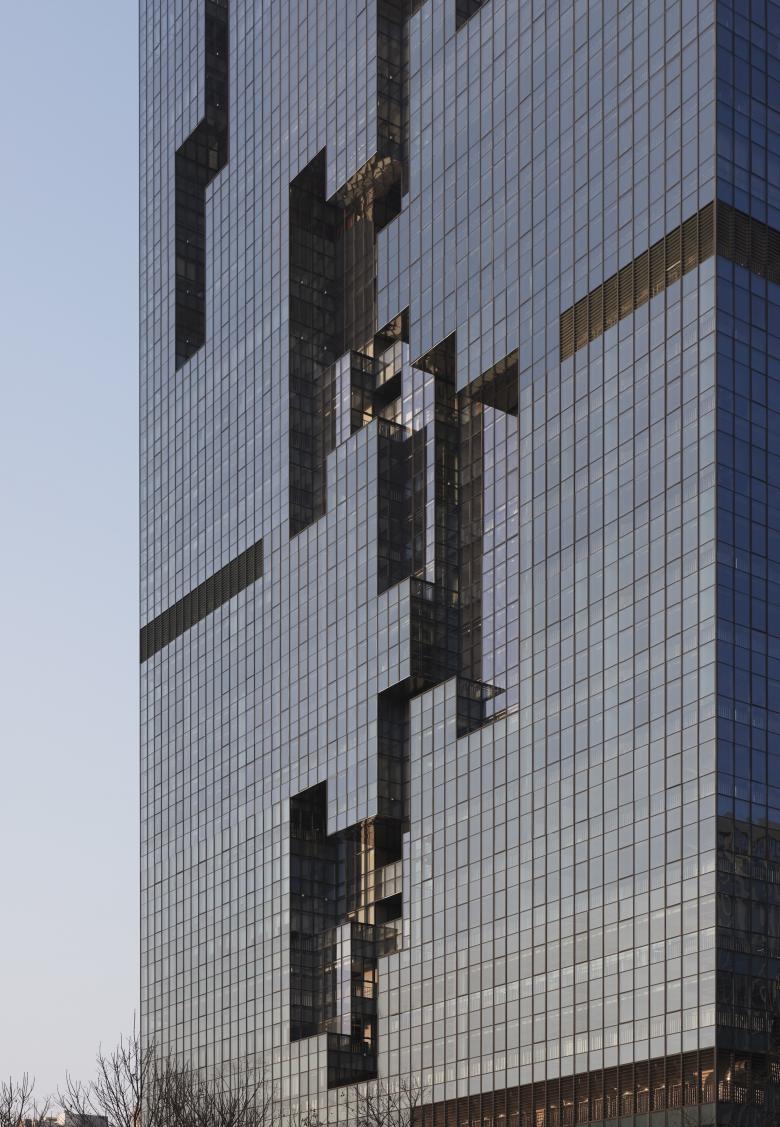For the curtain walls on the north, south, east, and west elevations, the mullions were designed to be as inconspicuous as possible. The building area is 3000m2 and the building height is 126m. In other words, this lump of glass has a volume of 380,000 cubic meters. The ``cracks'' on each side, north, south, east, and west, create the effect of making this mass look like a glass crystal. The ``crack'' brings daylight into the atrium, and at the same time is used as a private terrace for the offices facing it, as well as a common terrace connected to the atrium.
