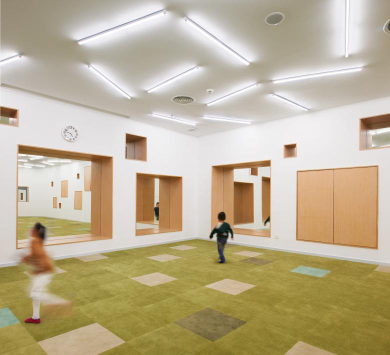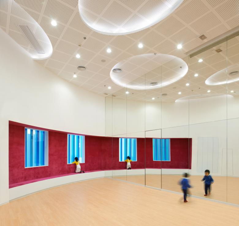 In the 16-meter-high atrium, 436 pencil-like poles have been erected to form five cylindrical volumes. The interiors of these cylinders are divided into three levels, housing rooms for 25 different activities, including a multipurpose hall, a theater, a dance studio, a picture book library, a sandbox, and a market.