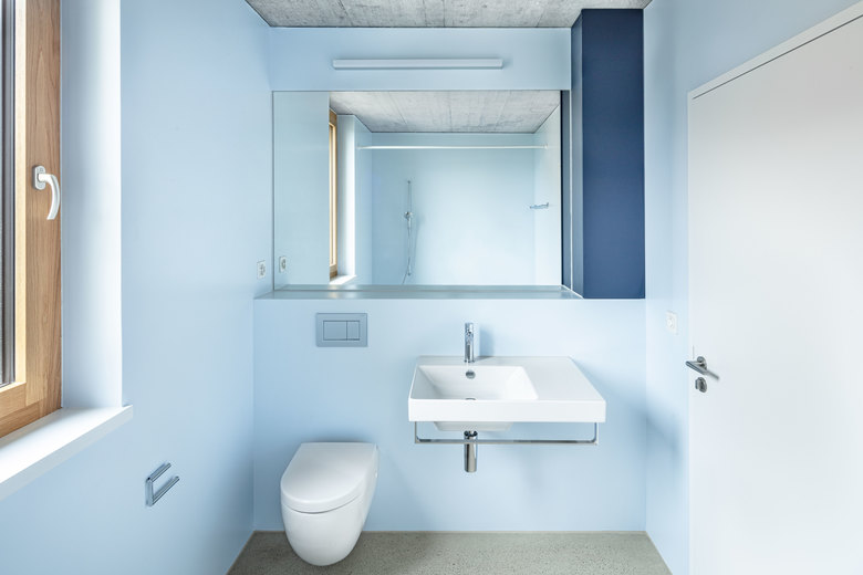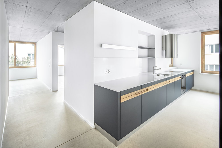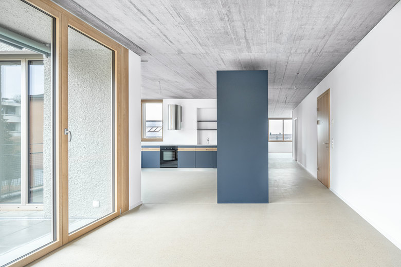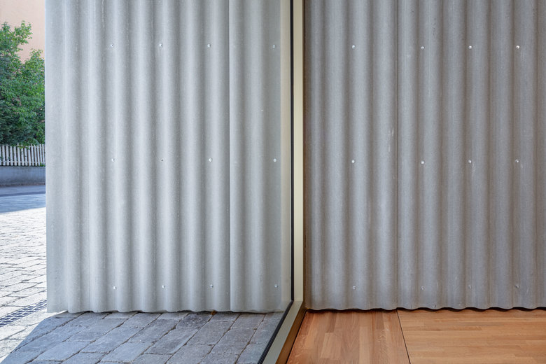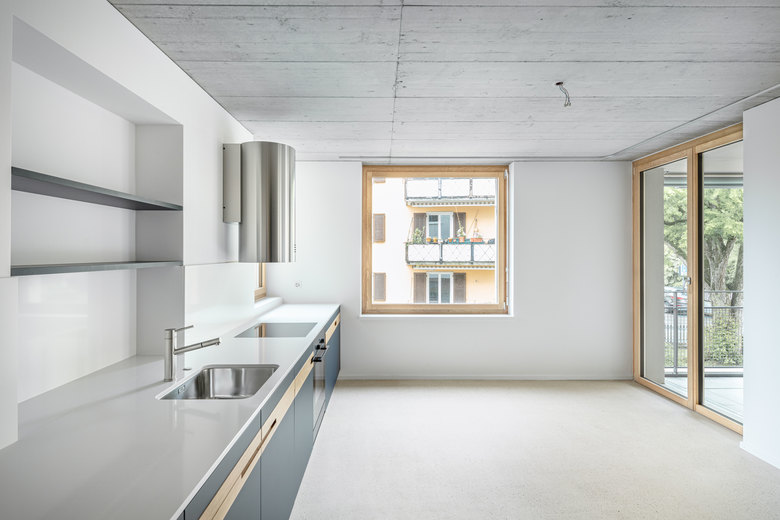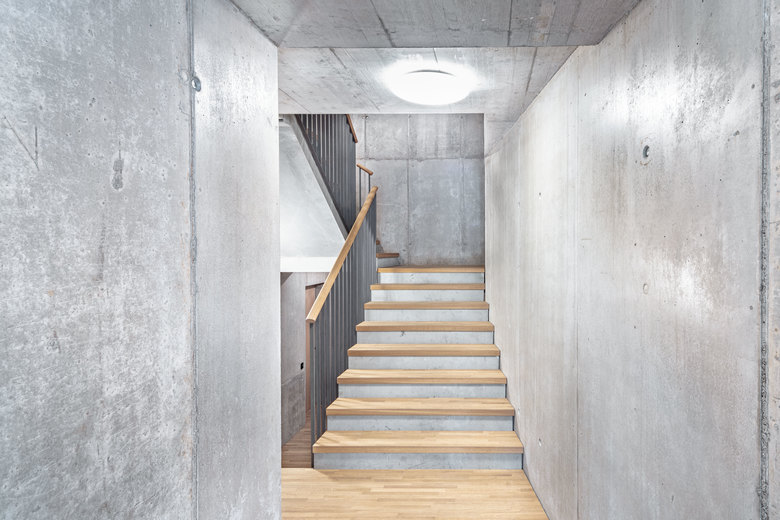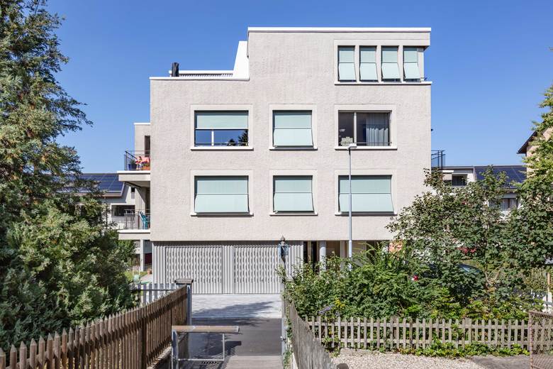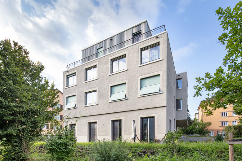 Das Wohngebäude ist vom architektonischen Ausdruck stark an die umliegenden Gebäude angepasst, welche ein schlichtes Erscheinungsbild aufweisen und somit dem Quartier einen Einheitlichen Charakter geben. Es ist ein verputzter Gebäudekörper mit Auskragenden Erkern, welche sich in der Erscheinung vom Baukörper entkoppeln, diesen aber strukturieren. Das Attika hebt sich von seiner Erscheinung ebenfalls vom Gebäudekörper ab. Ein verkleideter Holzständerbau, teilweise greifen die Verputzen Fassadenteile von den unteren Geschossen nach oben, verbindet die zwei Körper und lässt das Gebäude als Ganzes lesbar machen.