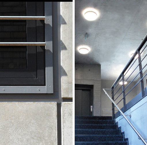 Baukörper und Funktion: Die Reduktion auf wenige aber prägende und gut alternde Materialien orientiert sich am 1.BA, unterstreicht die klare Baukörperkonzeption und vermittelt die typologische Gliederung der Nutzungen nach außen. Die ca. 40 Arbeitsplätze an der Westseite werden durch raumhohe Pfosten-Riegel-Verglasungen belichtet. Sichtbetonsandwichelemente mit flächenbündig integrierten Fassadenelementen für Erschließung, Belichtung und Belüftung sind an den 3 weiteren Außenwandseiten eingebaut und sorgen für einen eher introvertierten Charakter.