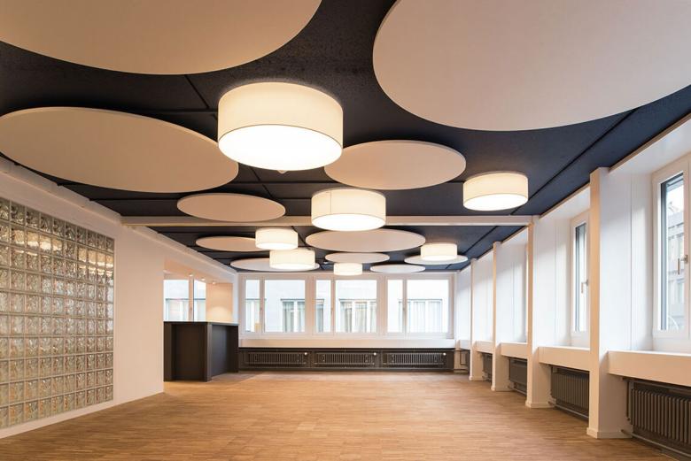 Die in der Armutsbekämpfung tätige Stiftung brauchte grössere Büroflächen für ihre wachsende Mitarbeiterschaft. Eine Etage eines ehemaligen Gewerbehauses stand für den Bezug zur Verfügung. Materielle Bescheidenheit, Kreativität und Transparenz waren die Stichworte für die Gestaltung der Räumlichkeiten. Durch ein starkes Farbkonzept in den Unternehmensfarben wird überspielt, dass es sich im Grunde um einen sehr kostengünstigen Umbau handelt. Die Elektroinstallationen an den Decken wurden sichtbar verlegt und nachtblau überstrichen. Leichte Akustiksegel aus recycelten Petflaschen und grossflächige LED-Leuchten bringen die Helligkeit zurück an die Decke. Die bestehenden, sattrot gestrichenen Betonstützen rhythmisieren den Raum. Die beiden Sitzungszimmer sind durch transluzente Glasbausteine vom Grossraum getrennt.