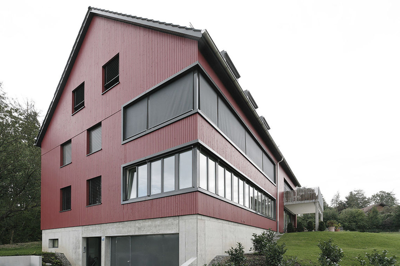 Ein ruhiger Baukörper mit Satteldach und Holzverkleidung steht unauffällig am Dorfrand von Sennhof. Form, Details und Material erinnern an traditionelle Bauten der bäuerlich geprägten Umgebung. Nur die markante Farbe lässt ihn aus der grünen Umgebung herausstechen. Aber auch sie stammt aus dem traditionellen Kanon der ländlichen Architektur.