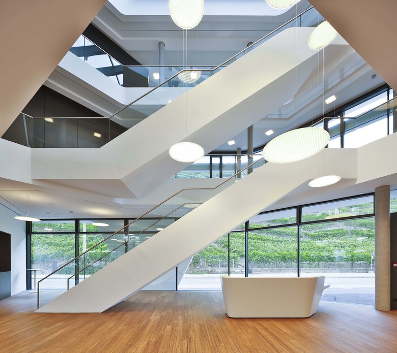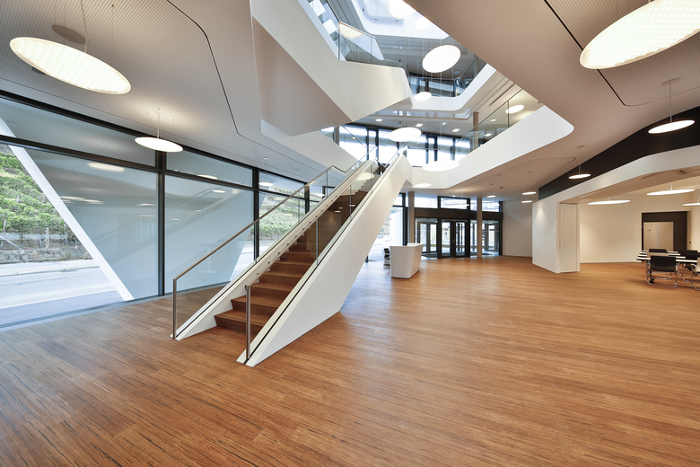 Gebäude als Stahlbeton-Skelettbau. Im Erdgeschoss Seminar- und Vortragsräume, Empfang, Foyer und Meeting Points. In den beiden Obergeschossen transparent verglaste Büroräume entlang den Fassaden nach Osten, Westen und Süden.