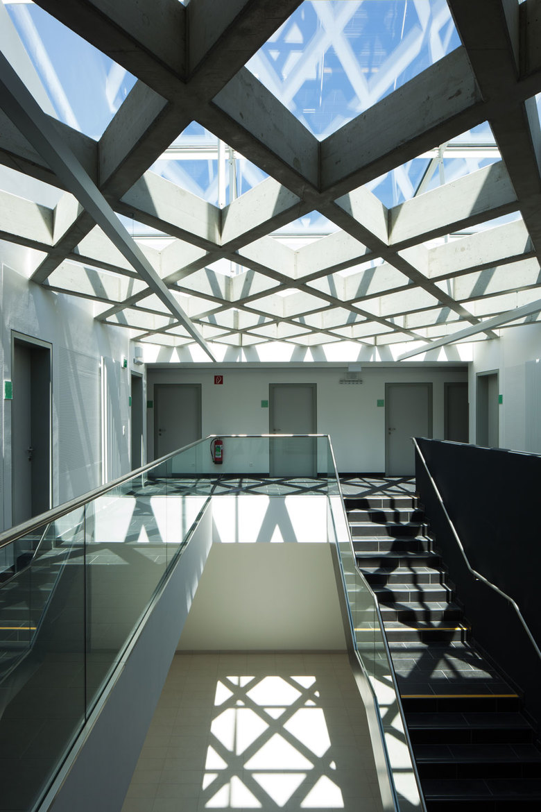 Zwei Funktionen, die Garage und der zweigeschoßige Personaltrakt, zusammengefasst unter einem Dach bilden einen klar ablesbaren Baukörper. Dessen Aufteilung ist eindeutig getrennt in Mannschaftstrakt und Garage . Durch diese Trennung sind die einzelnen Klimazonen klar ablesbar und auch konstruktiv umsetzbar. Erschlossen wird die Rettungsstation über den Fassadenrücksprung und in weiterer Folge über das Atrium, einem lichtdurchfluteten Innenraum, der die weitere vertikale Erschließung ins erste Obergeschoß signalisiert.