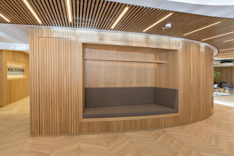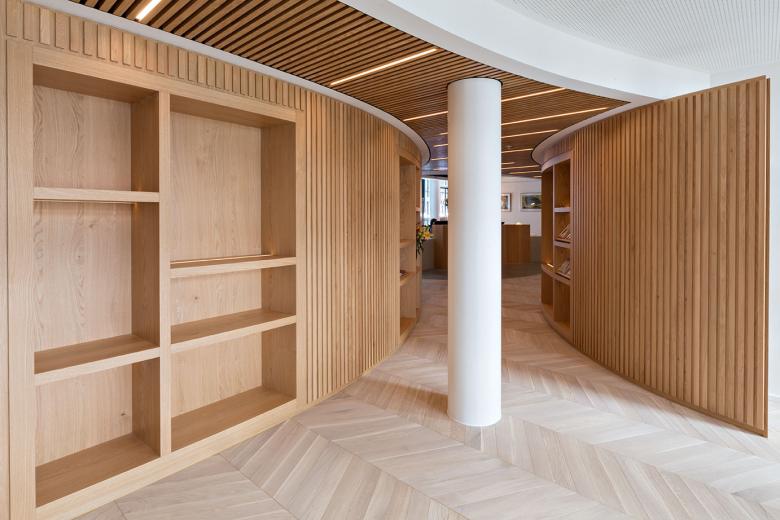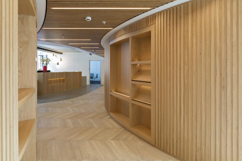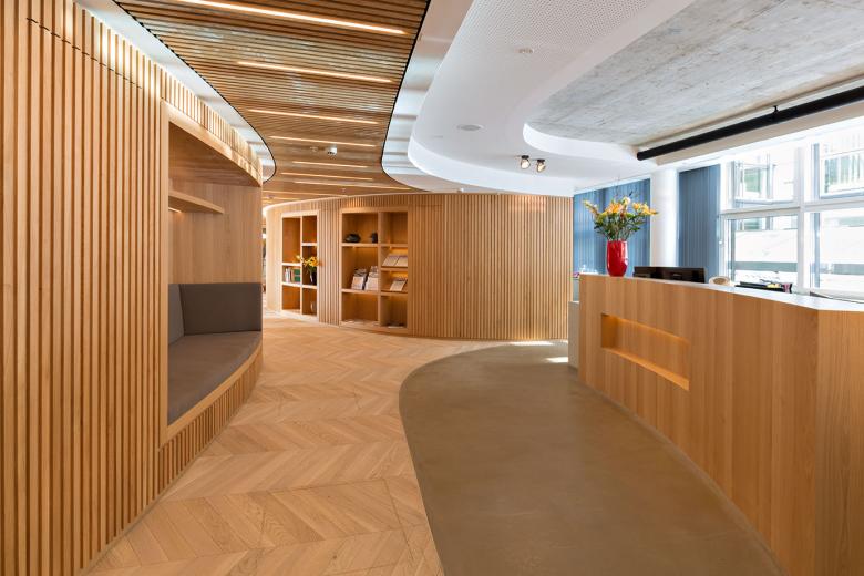 Die Räume fließen sanft ineinander über, die Belichtung leitet dezent, sämtliche räumliche Kanten sind abgerundet, insbesondere die Möbel weisen Krümmungen auf - so wird der Wohlfühl-Charakter noch einmal deutlich gesteigert und die Besonderheit dieser außergewöhnlichen Kanzlei-Gestaltung hervorgehoben.