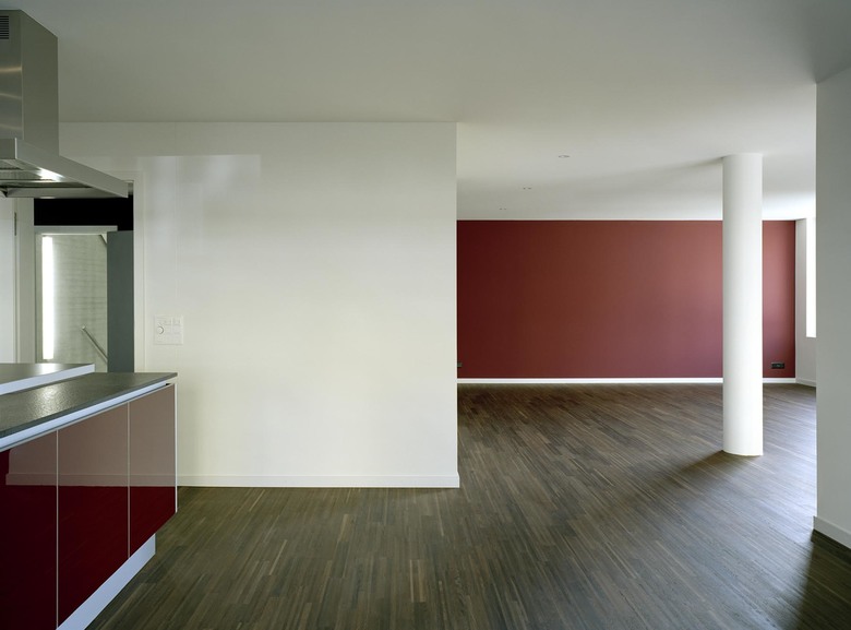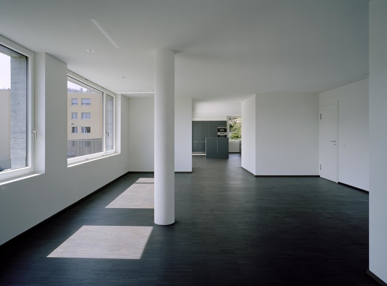 gleichermassen wie als Verteiler. Der "öffentliche Tagbereich", d.h Wohn-, Ess- und Küchenbereich, werden als ein Raumkontinuum verstanden, welches durch vor- und rückspringende Raumtiefen in unterschiedliche Zonen gegliedert wird. Angrenzend, je nach Lage der Wohnung ist die Terrasse dem Tagbereich zugeschaltet. Der Ausstritt erfolgt über Balkonfenstertüren durch die Haut der Fassade auf das Haus, respektive auf das Dach der unteren Wohnung. Der "private Bereich", d.h Schlafzimmer, Ankleiden und Nassbereich sind in einer Raum-zu-Raumfolge entweder direkt vom Entrée oder über den Tagbereich erschlossen. Sie sind zellenartig angeordnet und können in Ihrer Ausformulierung in der Wandfarbe und mit unterschiedlichen Bodenbelägen je nach Nutzung unterschieden werden.