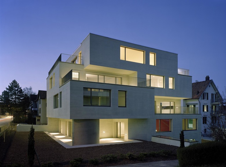 Die Materialität der Aussenhülle ist logische Konsequenz der volumetrischen Absichten. Ein Material als homogene Haut bindet die Vor-/ Rücksprünge und Hofmauer zu einer Einheit zusammen. Dabei werden horizontale und vertikale Flächen gleich behandelt. Die mit einer horizontalen Bretterschalung gefertigte Sichtbetonfassade schafft dabei eine übergangslose Verbindung von Untersichten zu Fassaden, von Fassaden zu Fensterleibungen und schlussendlich von Fassaden zu Terrassendachrand und dem Belag in vorgefertigten Betonplatten.