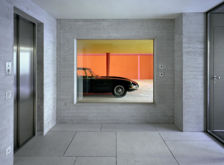 Die Garage ist neben dem Haupteingang und dem Foyer weiterer wichtiger Begegnungsort. Ganz nach dem Vorbild frührer norditalienischer Stadtvillen, zum Beispiel, soll auch diesem Raum grosse Bedeutung zugemessen werden. Kein trister, dunkler und beängstigender Aufbewahrungsraum für Autos, sondern ein freundlicher Ort der Ankunft und ein angemessener Hintergrund für die heutzutage immer wichtigeren metallischen Möbelstücke auf Rädern. Die Farbe, als Sequenz unterschiedlicher Tonalitäten von gelb, über orange zu pink und aubergine am Boden, verbindet die verschiedenen Elemente und Richtungen zueinander. Signaletik, Boden-, Decken- und Wandfarbe ergänzen sich so zu einem "grell" farbigen aber harmonischen Ganzen. Ein Bild, welches auch vom Foyer über die in den Beton geschnittene Öffnung sichtbar wird.