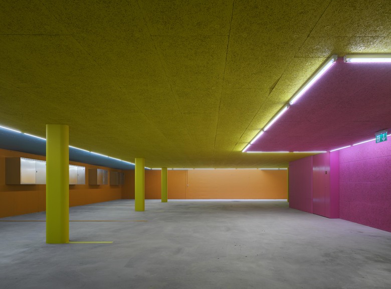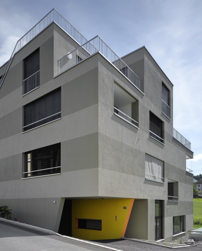 Das Volumen verankert sich derart massvoll und ohne gröbere Abgrabungen im gewachsenen Terrain und macht es möglich die Tiefgaragenabfahrt vollständig in das Haus zu integrieren, sodass im begrenzten Aussenraum genügend Freiraum vorhanden bleibt.