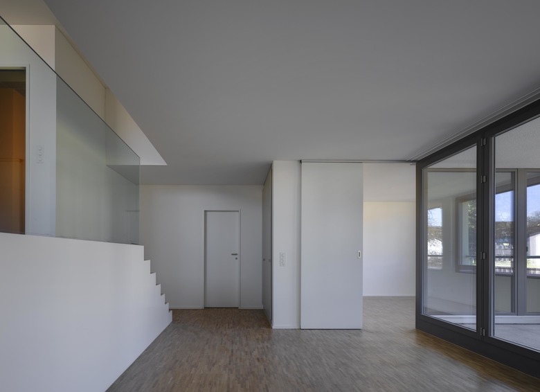Im Innern entstehen sieben unterschiedliche und individuelle Wohnungen, welche splittlevelartig überkreuz zueinander verschoben sind, wodurch eine gleichwertige Sonnenausrichtung und Allseitigkeit für jede Einheit erreicht wird.