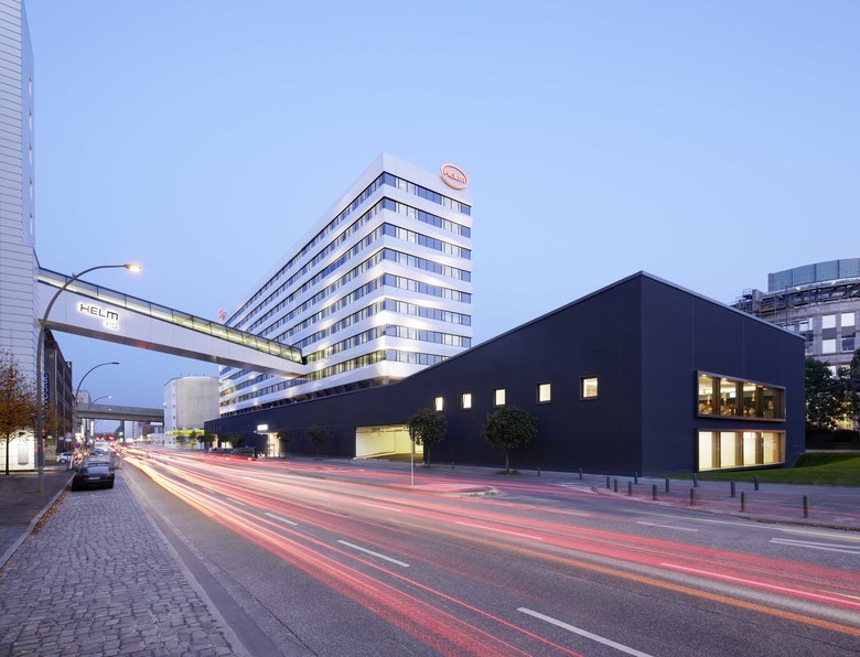 Die Hauptverwaltung der Helm AG liegt im Hamburger Stadtteil Hammerbrook. Ursprünglich von den Architekten Hans Jochem und Peter Hauske entworfen, bildet das 1972 fertig gestellte Gebäude mit dem gegenüberliegenden, in der Grundstruktur annähernd baugleichen Hanse-Haus ein städtebauliches Ensemble. Die Sanierungsmaßnahmen umfassten neben der Modernisierung der Büroflächen die Fassade, die gesamte Haustechnik sowie den Einbau einer Brücke, die die Hauptverwaltung mit den zusätzlich gemieteten Büroflächen im Hanse-Haus verbindet. Das Gestaltungsprinzip der bisherigen Fenster-Band-Fassade wurde im Wesentlichen beibehalten. Die horizontale Linienführung wird in der neuen Aluminiumblech-Fassade noch konsequenter umgesetzt und durch ein neues Motiv akzentuiert: Die schräg verlaufende Faltung in der weißen Fassadenverkleidung baut Spannung auf und lässt durch unterschiedliche Licht- und Schattenwirkungen im Tagesverlauf ein immer neues Erscheinungsbild entstehen.