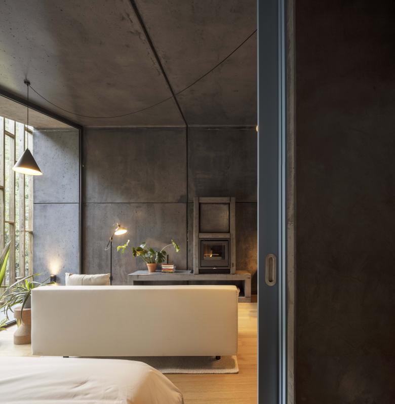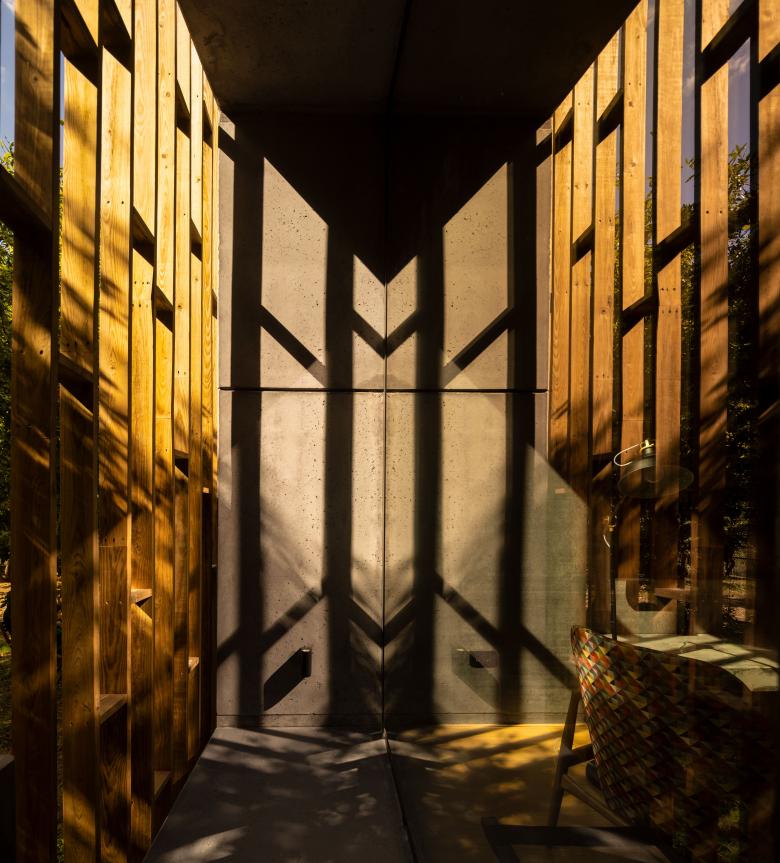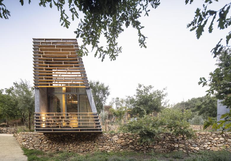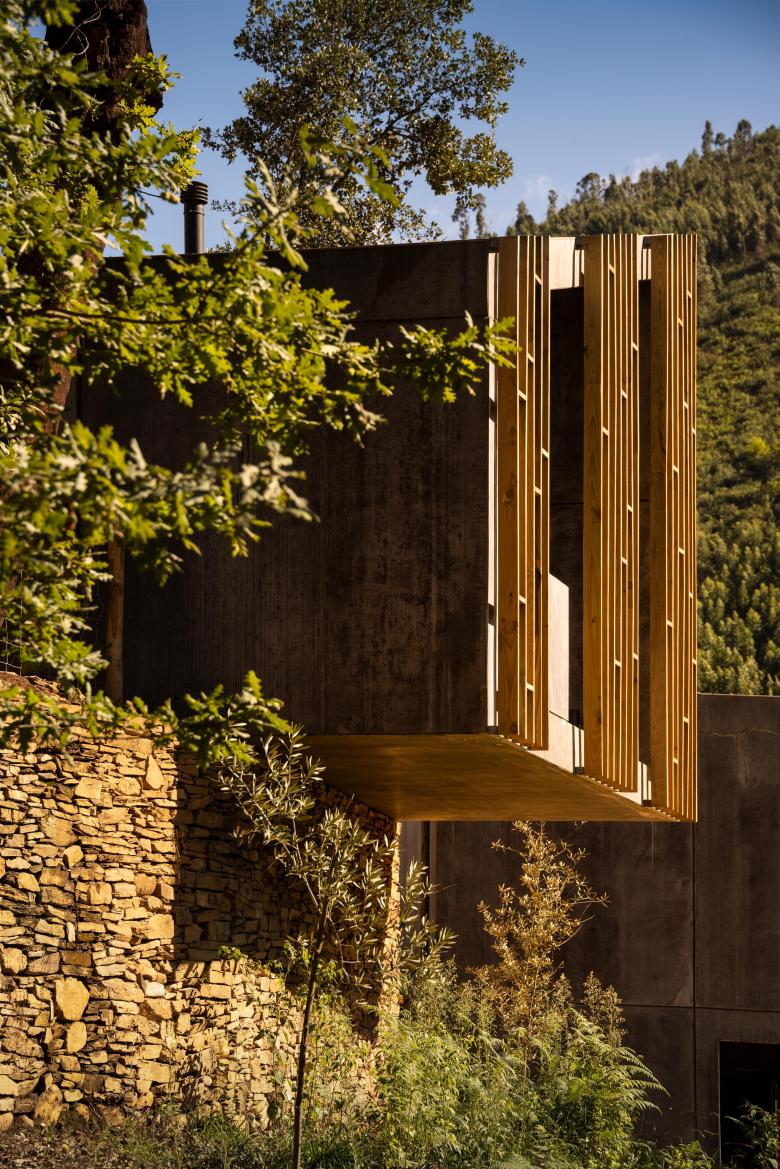The project is composed of eleven small cabins, including four different typologies, from 28sqm to 58sqm. They are distributed across the plot according to the natural configuration of the terrain, altering it as little as possible. The old stone walls and the existing trees were preserved – the houses were carefully placed around them. Combining this apparently arbitrary positioning with different orientations allowed the houses not to block each other’s views. From the balconies, behind the wooden slats, we can see the forest and, in some cases, the river.