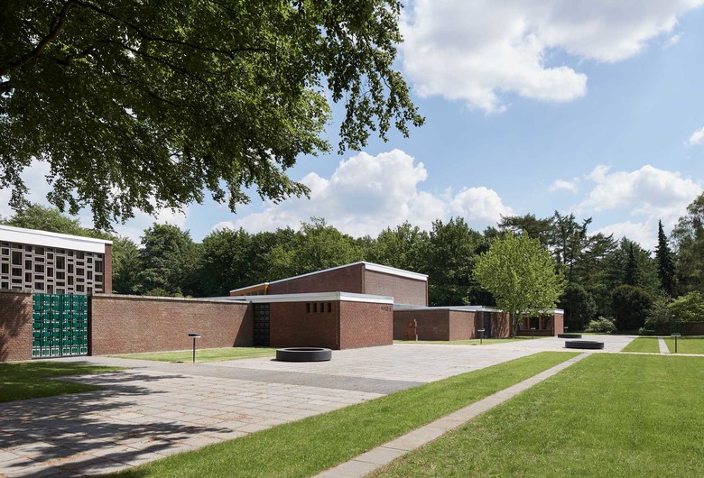 Die Feierhallen lehnen sich an den abgesenkten großvolumigen Gebäudekomplex des Krematoriums an. Der harfenartige Grundriss der drei Hallen orientiert sich mit Ein- und Ausgängen ganz klar auf die parkartigen Freiräume im Südwesten. In diese parkartigen Freiräume sind die kreisförmigen Rasengrabfelder eingebettet.