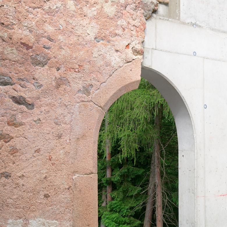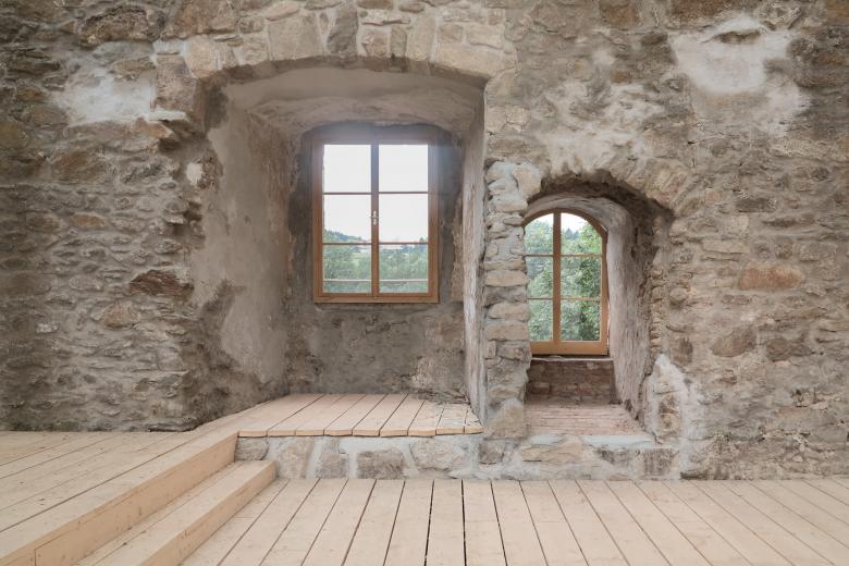 Nun zur Architektur. Die ersten, dringend notwendige Bestandssicherung haben wir behutsam durchgeführt, ohne Wunden in das alte Mauerwerk zu schlagen. Seit nunmehr fast 700 Jahren ist die Baugeschichte der Burg Reichenau einer stetigen Veränderung unterworfen. Unsere Revitalisierung und Adaptierung fügt einen weiteren Baustein hinzu. Die neuen Elemente sprechen aber ganz bewusst die Material- und Formensprache des 21. Jahrhunderts.
