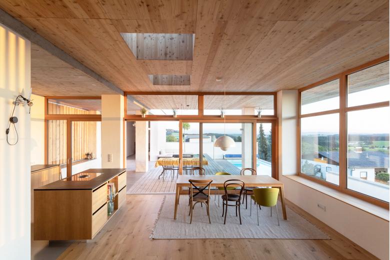 Begleitet wird das gesamte Erdgeschoß von Terrasse, Poolebene und Zugang zu Garten. Diese abgetreppte Terrassenlandschaft führt zu einer "Verlängerung" des Wohnraumes, wodurch die Grenze von Innen und Außen verschwimmt, bzw. Terrasse und Garten zu einem außenliegenden Wohnraum wird.