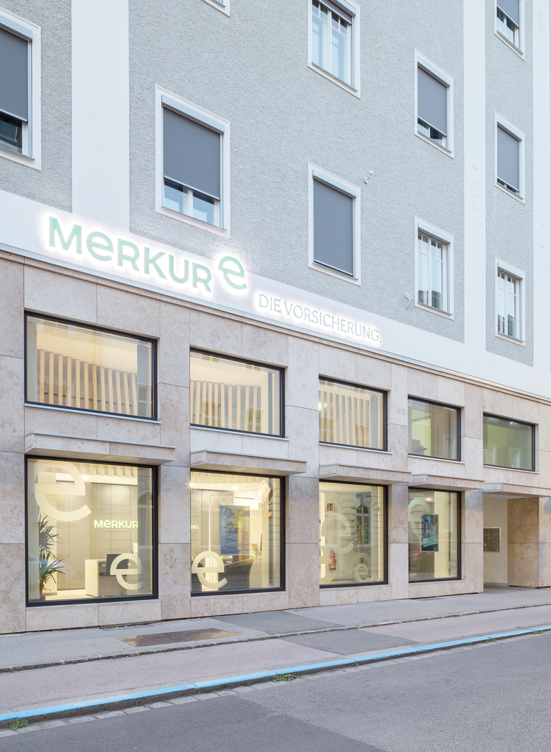 Mit dem Ziel einer harmonischen Einordnung in die Umgebungsarchitektur wurde bei der Neugestaltung der Fassade auch das ursprüngliche Fassadenkonzept aus dem Jahre 1912 analysiert. Die schlichte Steinfassade der ersten beiden Geschoße spricht eine ruhige und unaufgeregte Sprache und greift das damalige und gängige Gestaltungsmittel einer 2-geteilten Fassade auf.