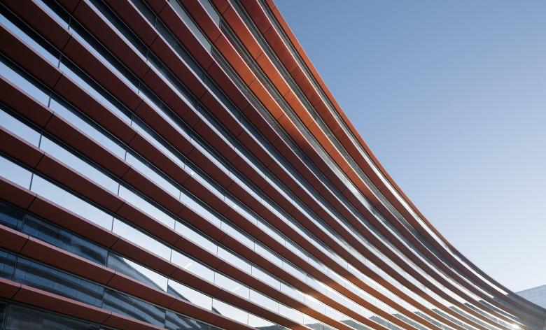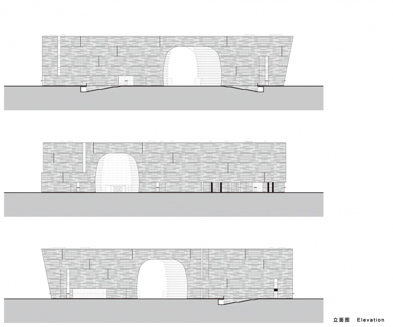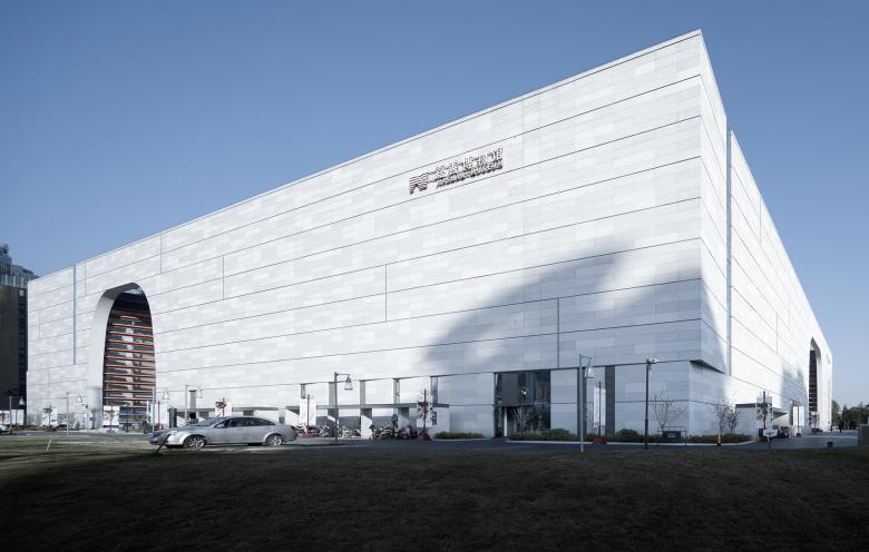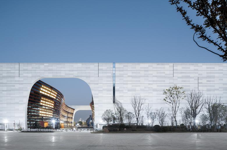 The architecture has a smooth and simple appearance, which is complemented by large areas of flat and light-hued stone curtain walls and characterized by texture contrast. Inner facades draw on the stacked structures of brick kilns, and form brick-red curved surfaces. The strong contrast of external and inner facades implies the idea that the unexpected and spectacular is hidden in a plain shell. The whole architecture is like a natural jade that reveals brilliance after being cut open. It's also like a city that collects culture and treasure, which echoes the design theme "Book Repository and Treasure Kiln".