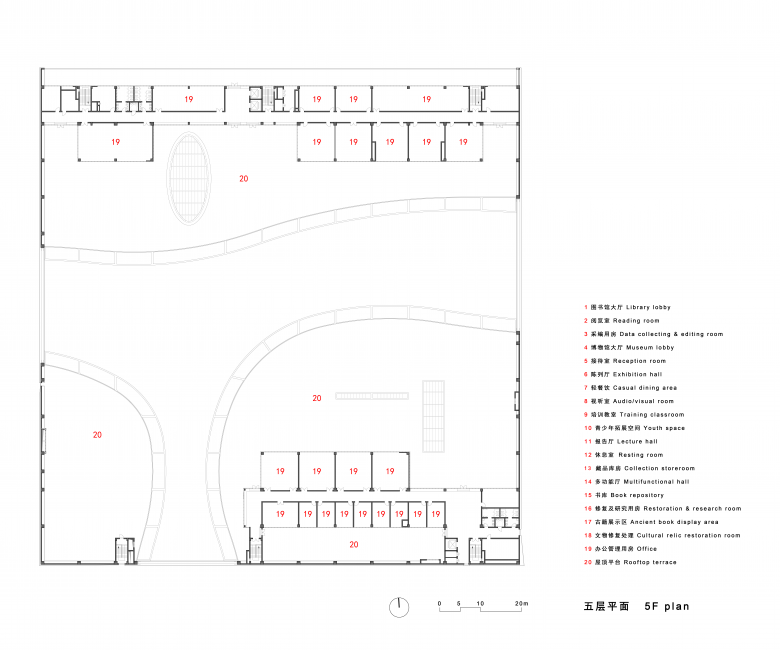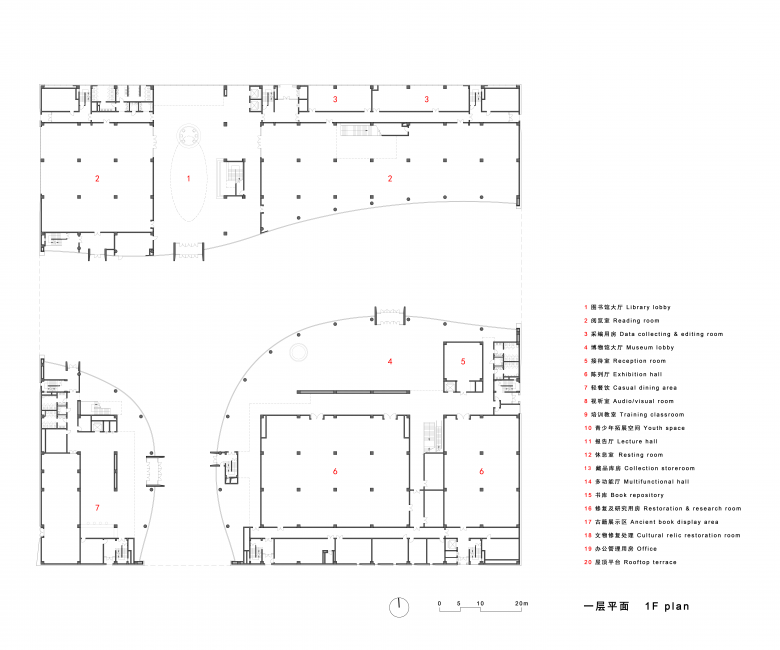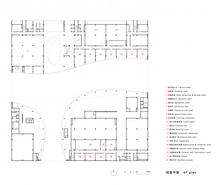 The library sits on the north side and faces the river. It boasts ample daylighting on north and sides, and the museum isolates it from the noisy urban road. The building volume at southwest corner and close to the open urban landscape area accommodates shared ancillary facilities for the museum and library, including lecture hall, casual dining area, etc.