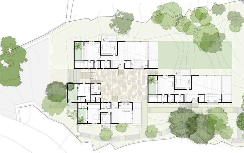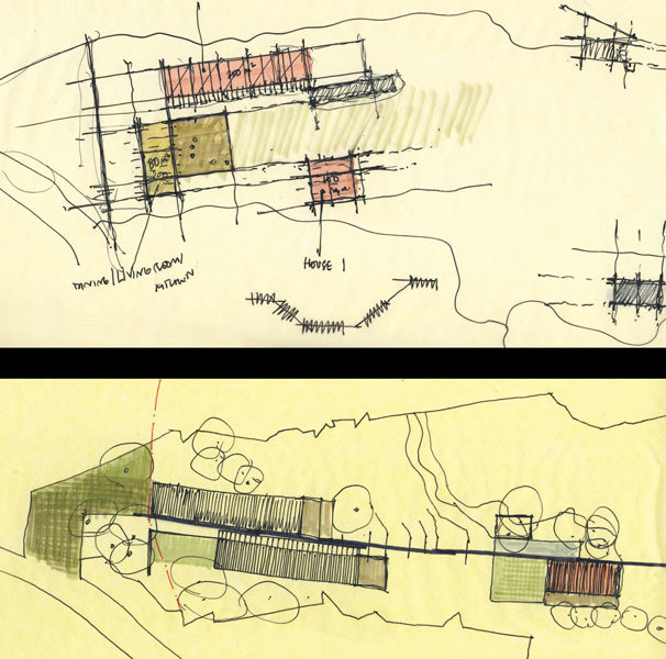 A set of three vacation homes were designed for a three friends, on a sloping site overlooking paddy fields and a tributary of the Mandovi river near Aldona in Goa. The site was located on an erstwhile cashew plantation. The project sought to maximize the beautiful vistas from within each individual unit while at the same time preserving the natural landscape of the site.The residential units, with their horizontal plinths floating above the ground to create a level datum, and lightweight roofs were thought like tents on a camping site. The houses were clustered around a central garden courtyard, envisaged as a perfect place for enjoying a meal or socializing with friends while on vacation.