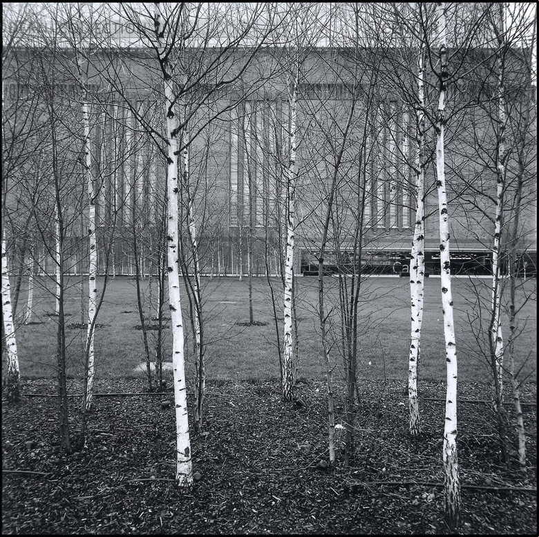 The new landscape of the Tate Modern Gallery works with nature and is about nature, with the river and about the river: Its tides, its colors and its sedimentation. As a whole, this informal landscape unites the varied existing and new elements across the site and is comprised of generous public spaces, a large planted embankment and lawn areas. The Oil Tank Wall is a key spatial element of this design and is an above-grade extrusion of the existing below ground Oil Tanks. The organic appearance and materiality of the wall evokes the natural geology of the Thames River Valley, with the exposed aggregate concrete morphing from light to heavy, gradually revealing the matrix of locally sourced flint stones cast within. The Oil Tank Wall encloses two large, circular terraces to the south and east of the building, which are the principal public gathering places directly adjacent to the new gallery entry and café. The strong presence of the Oil Tank Wall is countered by the soft landscape elements: The mass of the Spine Planting, feature tree clusters and the soft, undulating expanse of the Southern Lawn. The dense spacing of multi-stem Betula species in the Spine Planting reflects the alluvial character of the landscape and creates a green backdrop to the Southern Lawn. Collectively, the strong topography of these two elements gives an increased sense of depth to the narrow site. A mixture of bulbs and perennial plants are planted beneath the birch trees, creating a densely vegetated understorey. Feature tree species more typical of urban public spaces are planted in clusters intermittently around the site, their selection informed by species already existing. In comparison with the Southern Landscape, the character of the Western Landscape is much less influenced by the presence of the new gallery. The Western Goods Handling Zone and bicycle shelter are screened from view by dense hedge planting and a gently mounded circular lawn – a temporary intervention - occupies the majority of the western aspect of the site.