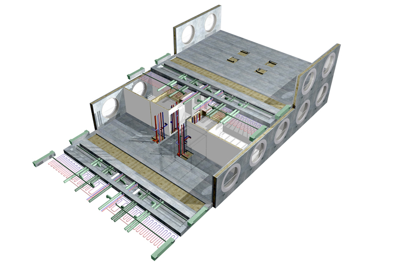 Der integrale Rohbau übernimmt über seine traditionellen Aufgaben hinaus auch haustechnische Funktionen. Die Raumseite der weitspannenden Betonfertigteil-Decken wird zur Kühlung/Heizung aktiviert. Die hochgedämmten Fassaden-Sandwichelemente integrieren die Lüftung. Die Regelung von Wärme/ Kühlung und Lüftung erfolgt dezentral und ist raumweise möglich. Der Rohbau führt sämtliche Leitungen und bildet mit modularen Ein- und Auslässen die Schnittstelle zum weiteren Aus- und späteren Umbau. Dieser ist auch aufgrund der Stützenfreiheit modular praktisch unbegrenzt möglich. Das Gebäude ist aus diesen Gründen langfristig nutzungsflexibel und technologieoffen. Es kann kontinuierlich an neu gewonnene Erkenntnisse angepasst werden – der integrale Ansatz erlaubt das fortlaufende Optimieren und verlängert die Lebensdauer insgesamt.