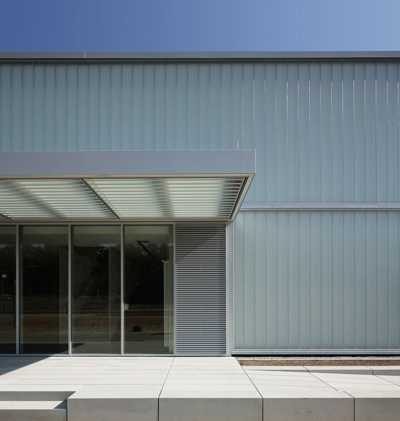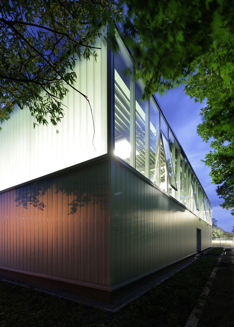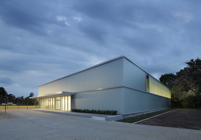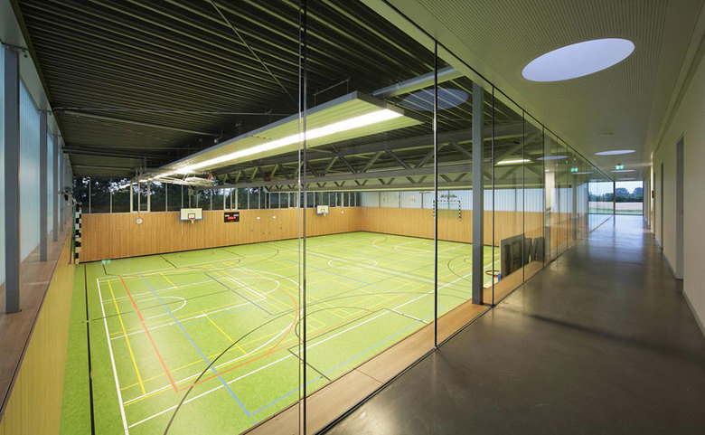 Die neue Sporthalle präsentiert sich als schlichter gläserner Quader. Ihr Eingang ist zur Grundschule hin orientiert und wird durch ein auskragendes Vordach betont. Im Erdgeschoss befinden sich neben dem Foyer die Technikzentrale, Geräteräume sowie ein Vereinsraum. Eine im Foyer gelegene Treppe führt ins Obergeschoss, in dem die Umkleideräume untergebracht sind. Der Erschließungsgang, der die Umkleiden von der Halle trennt, dient auch gleichzeitig als Tribüne. Von ihm aus eröffnet sich ein Panoramablick in die gesamte Halle. Axiale Ausblicke lassen die angrenzenden Freiräume erlebbar werden.