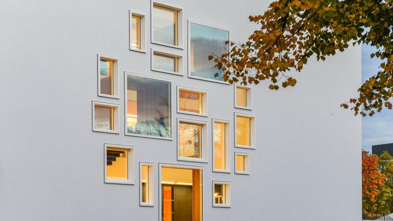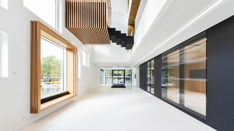 Die durch die Fensterrahmen bildartig in den Innenraum wirkende, bewegte Außenwelt schafft die inspirierende Umgebung für den wissenschaftlichen Austausch. Gleichzeitig öffnet sich der Innenraum nach außen in den Stadtraum und ermutigt das interessierte Publikum zum Betreten und Erleben des Forschungszentrums. Der Eingangshalle mit den Konferenzräumen lebt von einer reduziert-eleganten Atmosphäre, geprägt durch hellen Terrazzo, schwarze Wand- und Bodenbeläge und hochwertige Holz- und Glaselemente. Ein Kontrastprogramm erleben die Forscher:innen in den beiden hochmodernen Laboretagen, in denen sich jeweils eine auffällige, frische Farbigkeit in Blau oder Pink von Decken- und Bodenbelägen, über das Mobiliar bis hin zu den Sanitärbereichen zieht.